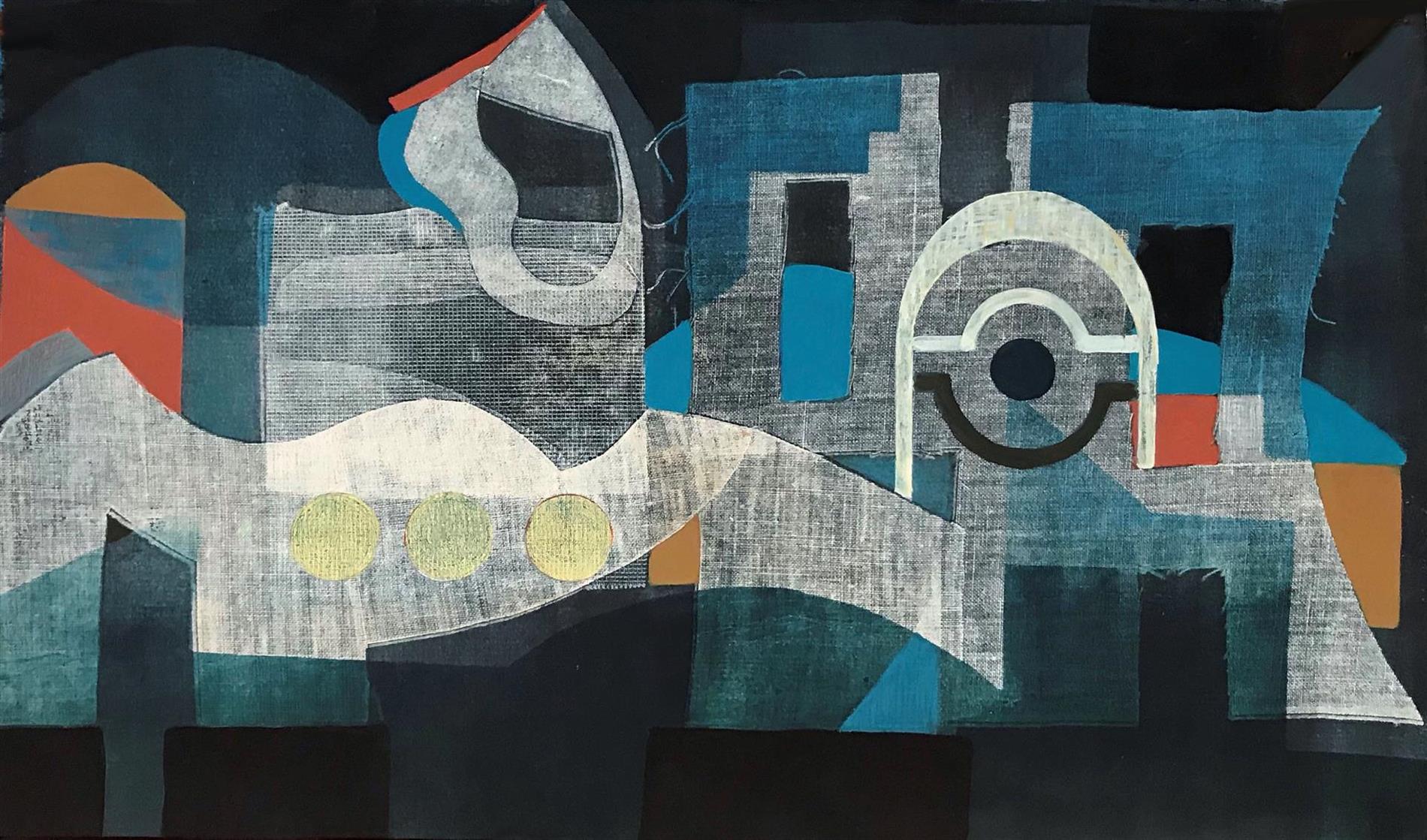 Combining strong graphic design with interesting texture, this skillful monotype evokes landscape and architecture, hills and sea. The shapes, transitions and color are truly engaging.